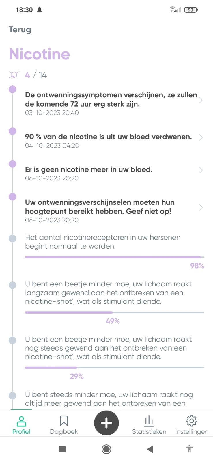 Inmiddels is mijn leven iets rustiger geworden, en zit ik nu op mijn achtste dag zonder sigaretten. Ik heb de app ‘Kwit‘ geïnstalleerd, die me een mooi overzicht geeft van mijn voortgang en bovendien met grappige feitjes komt.